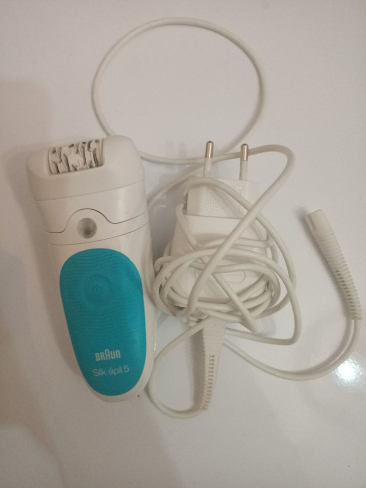 Braun Silk-épil 5 epilatör, pastel mavi tutma yeri ve beyaz gövdeye sahiptir. Güç adaptörü ile birlikte gelir. Kompakt ve pratik tasarımda tüy alma cihazı.