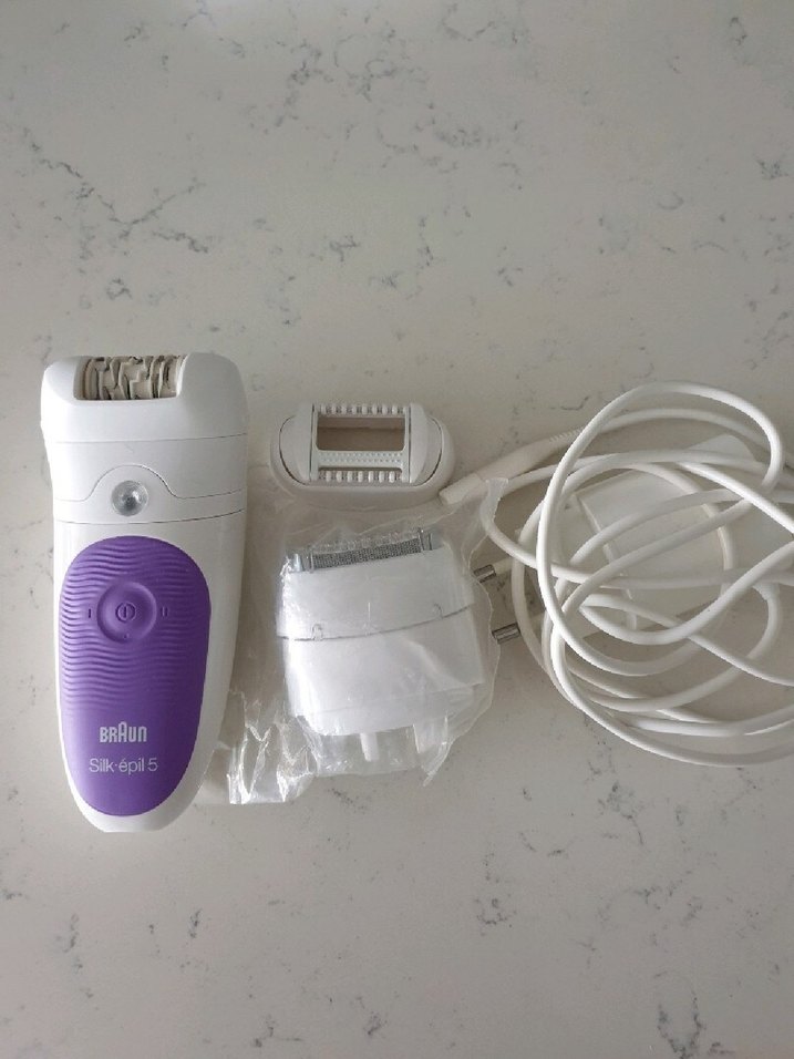 Braun Silk-épil 5 epilatör, açık mor renkte ve ekstra başlık ile güç kablosu ile birlikte gelir.