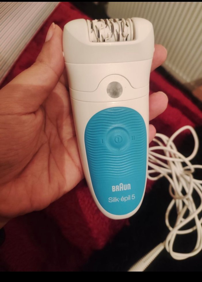 Braun Silk-épil 5 pastel beyaz renkte, mavi tutma alanına sahip epilatör. Çoklu cımbızlarla etkili tüy alma sağlar. Kompakt ve kolay tutulur. tertemiz yeni gibi...iki kez kullandım.. lazer yaptırdıktan sonra artık ihtiyacım yok