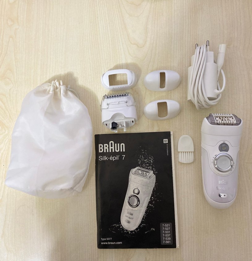 Braun Silk-épil 7 epilatör seti; cihaz, değiştirilebilir başlıklar, temizlik fırçası, güç kablosu ve saklama torbası içerir. Çok yönlü tüy alma imkanı sağlar. Ürün az kullanıldı. Görseldeki ürünler dahildir. Kutusu yoktur bezi vardır. En küçük tüyleri bile görür. Islak- kuru farketmeksizin kullanılabilir. #epilasyonaleti #kozmatik #epilasyonseti #epilasyon #epilasyoncihazı #güzellik ✨