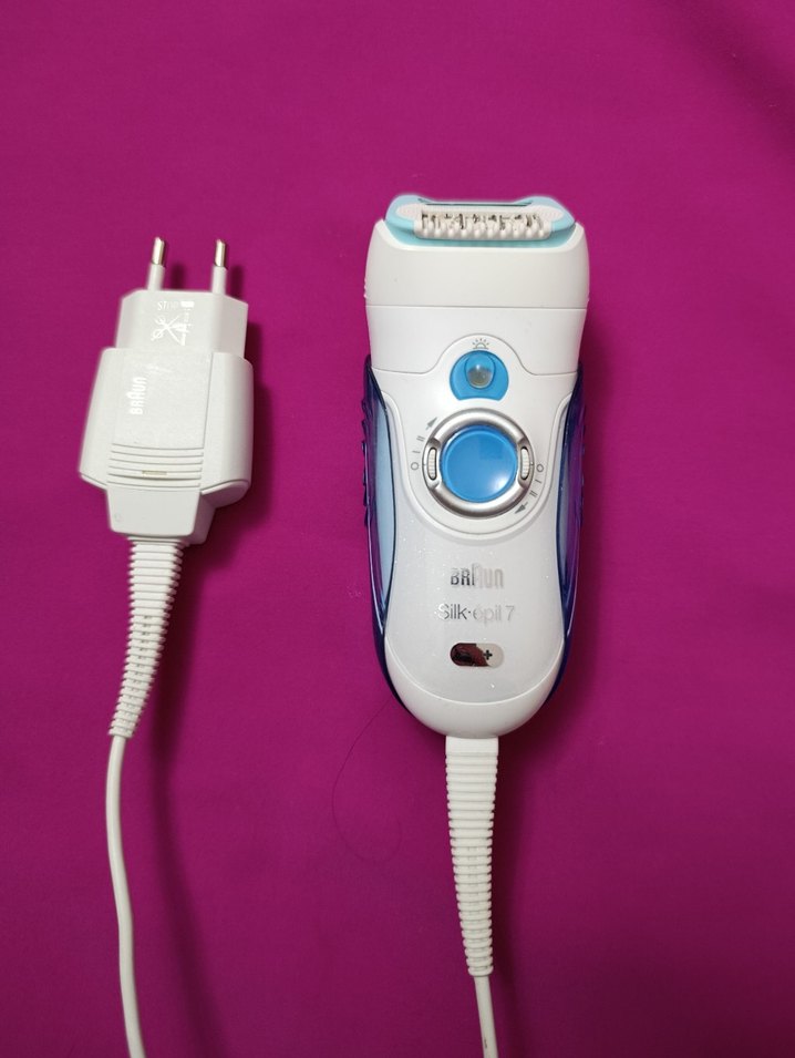 Beyaz Braun Silk-épil 7 epilatör, hafif tasarımlı ve kullanımı kolay güç adaptörü ile birlikte.