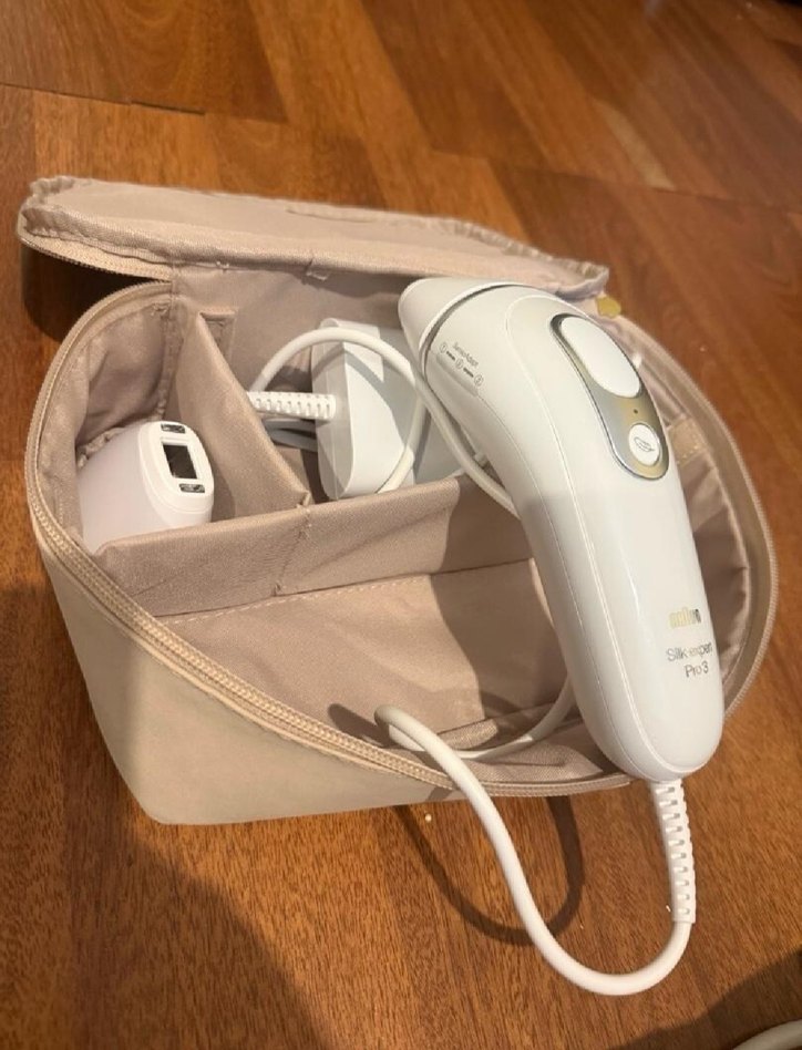 Bej renkli, ergonomik tasarıma sahip lazer epilasyon cihazı. Güç adaptörü ve taşıma çantası ile birlikte gelir. ✨. garantisi devam ediyor.
