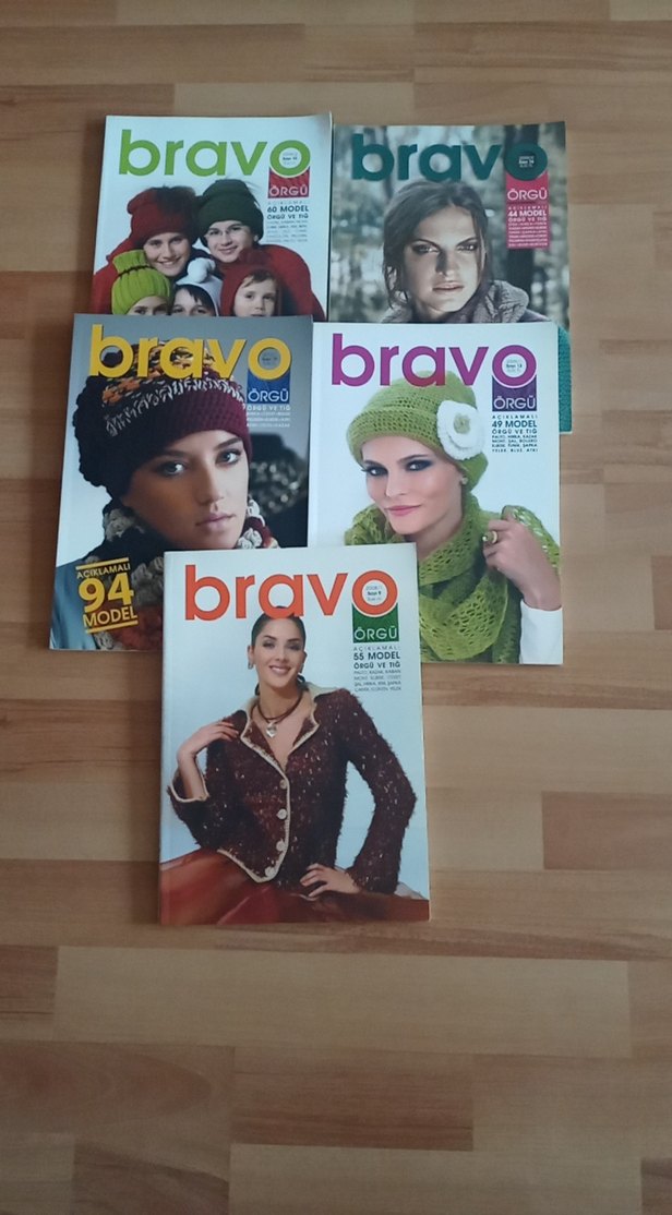 Farklı modeller ve örgü stilleri sunan beş adet Bravo örgü dergisi seti. Her sayıda çeşitli örgü modelleri yer alıyor.