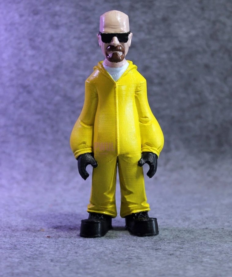 Siyah eldivenler ve güneş gözlüğü takan, koyu sarı tulum giymiş aksiyon figürü. 3d yazicida cikartilmistir