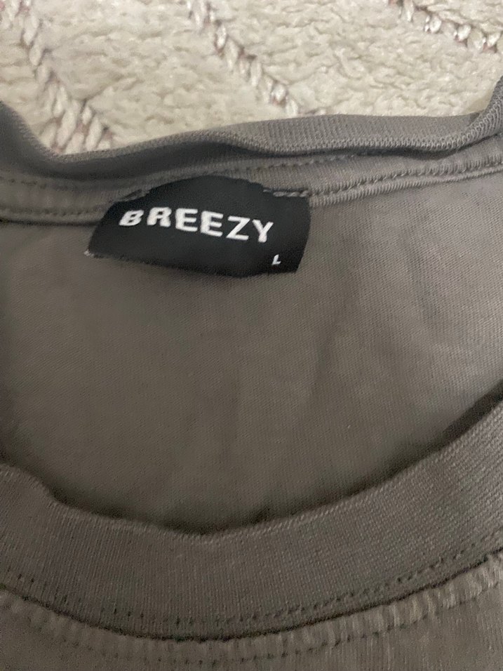 Breezy markalı, gri renkli, kısa kollu ve kruvaze yaka hamile tişörtü. Yumuşak keten kumaştan, baskılı ve tokalı detaylı, günlük rahat kullanım için uygun.