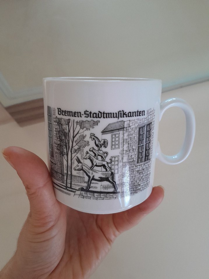 Bremen-müzikali yazılı, siyah detaylı çizimle beyaz parlak kupadır.