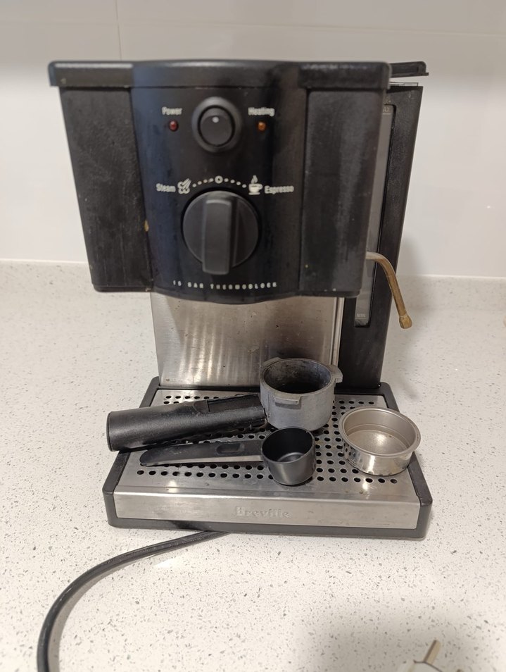 Breville marka siyah espresso kahve makinesi, güç ve ısıtma göstergeleri ile buhar ve espresso ayarlarına sahip. Portafilter ve aksesuarlar dahil. ☕