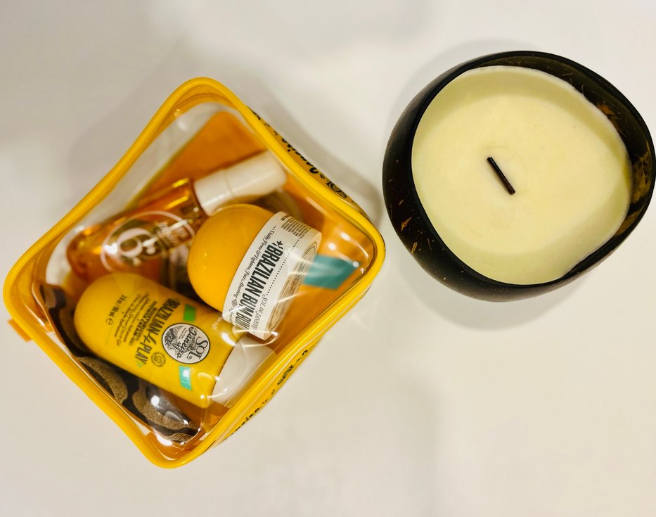 Sarı şeffaf poşette Brezilya Kabuğu vücut bakım ürünleri.