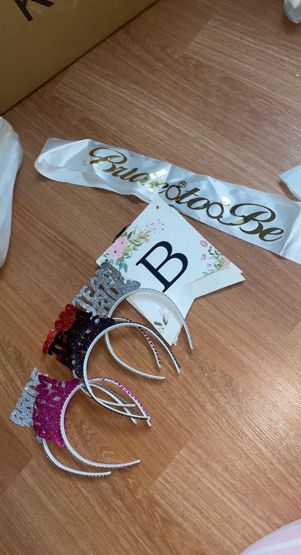 Bride to be kuşak,5 tane renkli taç ekstra 2 tane daha gönderilecektir kenarları çıktığı için ücrete dahil değildir 2 tanesi. Bride to be yazan pankart dahil. Kuşak,pankart ve team Bride renkli taçlar. Sadece bir kere kullanıldılar uygun fiyata verilecektir.
