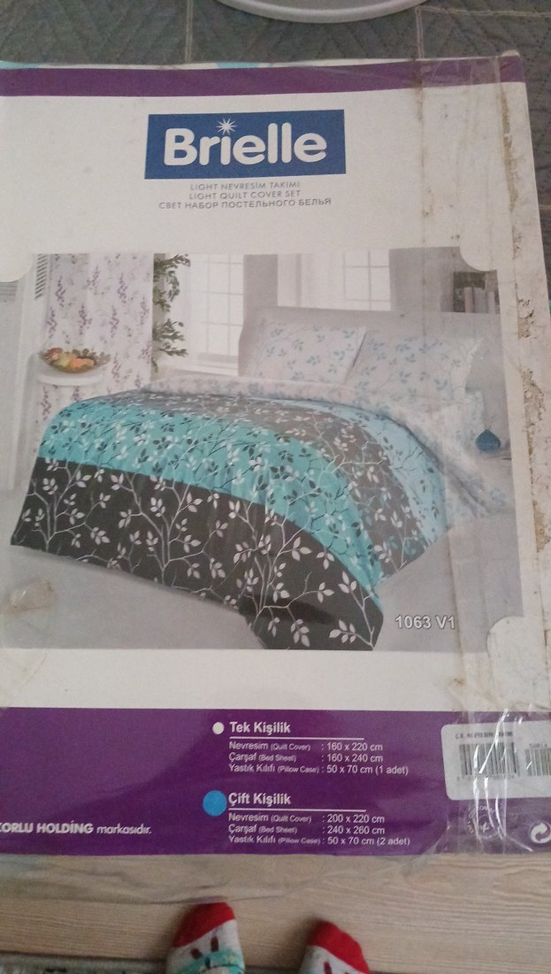 Brielle çift kişilik nevresim takımı, gri ve mavi baskılı çiçek desenleriyle. Nevresim, çarşaf ve yastık kılıflarını içerir. Hafif ve yumuşak kumaş.