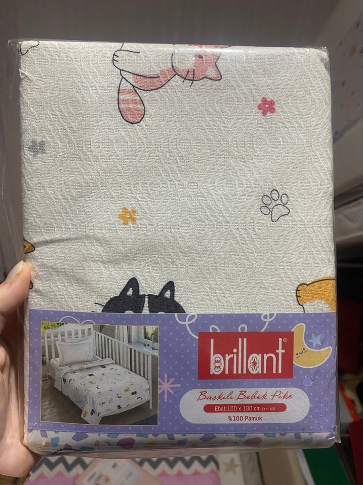 Brillant markalı bebek pikesi, pastel renklerde baskılı %100 pamuk kumaştan yapılmıştır. 100x130 cm ölçüsünde yumuşak dokulu bir üründür. Kedi desenli paketi açılmamıştır
