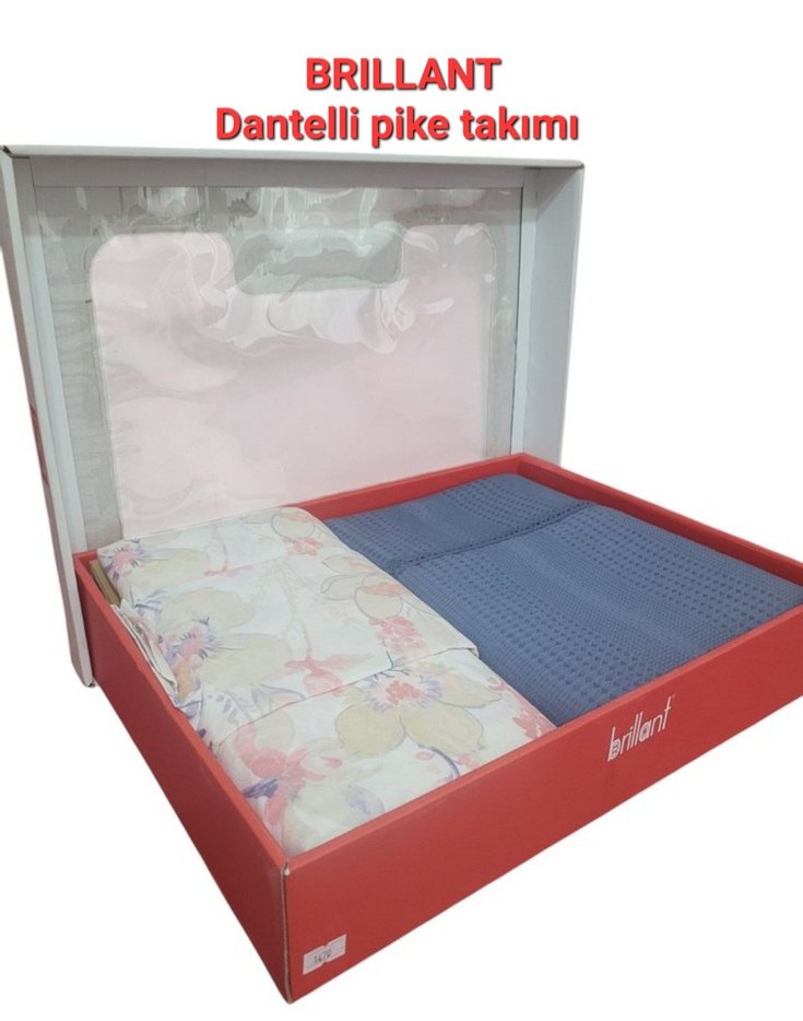 Sıfır üründür. Kendi kutusunda gönderilecektir. Çift yastık Çift kişilik carsaf ve dantelli Çift kişilik pike ürünlerini içermektedir