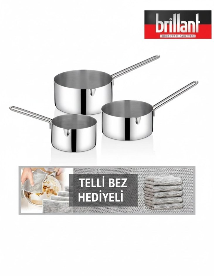 Brillant markasının parlak beyaz renginde, uzun saplı üçlü sos tenceresi seti. Telli bez hediye olarak verilmektedir.