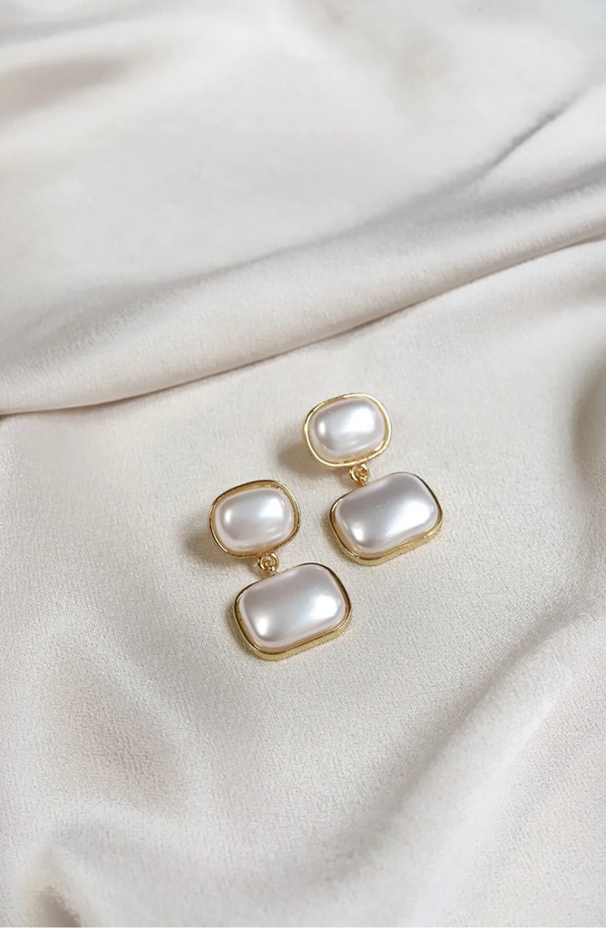 Parlak altın renkli, kısa uzunlukta ve sedef detaylı bu küpeler minimalist ve modern klasik tarzı yansıtıyor, düğünler için uygundur.