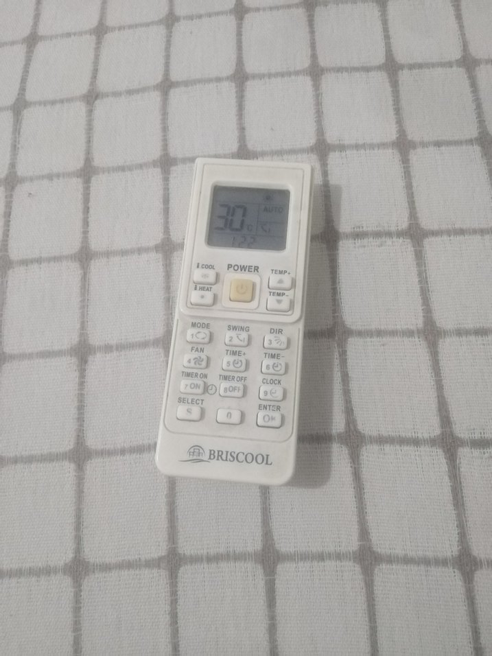 LCD ekranlı, güç, sıcaklık ve mod ayar düğmelerine sahip gri Briscool klima kumandası. ️