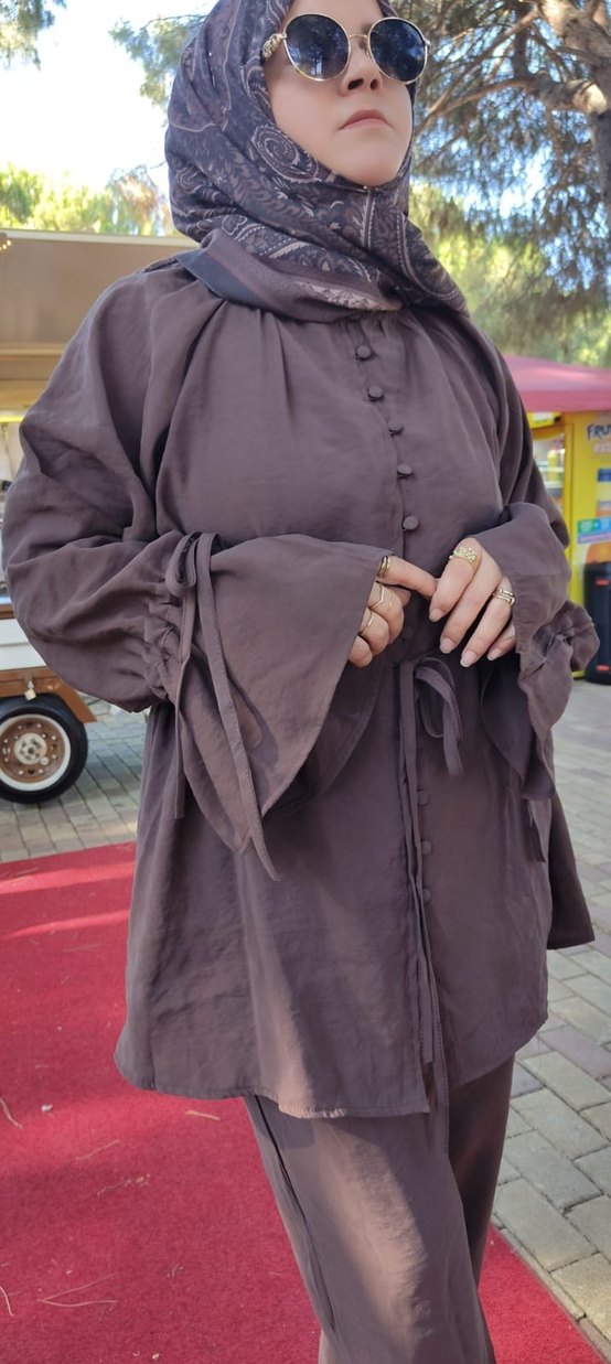 Düğmeli, bol kesim, uzun kahverengi keten tunik. Yüksek yakalı, bağcıklı uzun kollu, bohem ve mütevazı tarz için uygun.