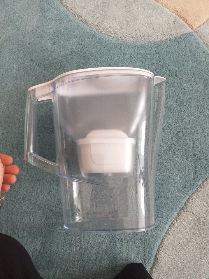 Beyaz kapak ve kulplu, iç kısmında filtre bölümü bulunan şeffaf su sürahisi. Kolay dökme ve saklama için tasarlanmıştır.