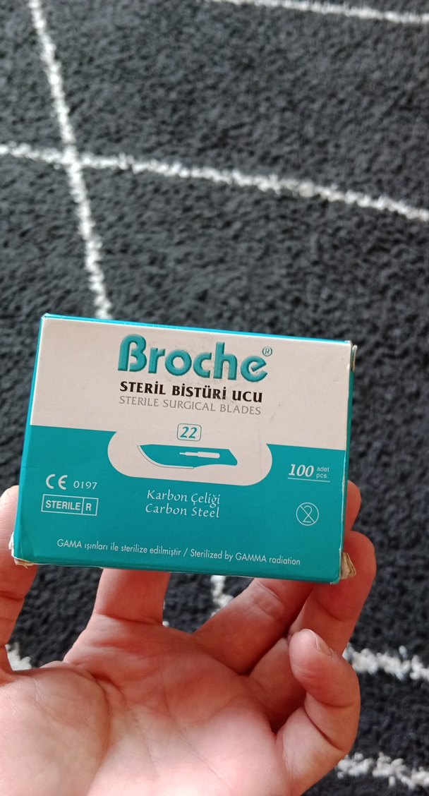 Broche markalı, karbon çeliğinden üretilmiş 22 numara steril bistüri ucu. Gama ışınları ile sterilize edilmiştir. Tek tek paketli sterildir. Pakette 74 adet kaldı, okul bitti bizimde işimiz bitti bununla :)