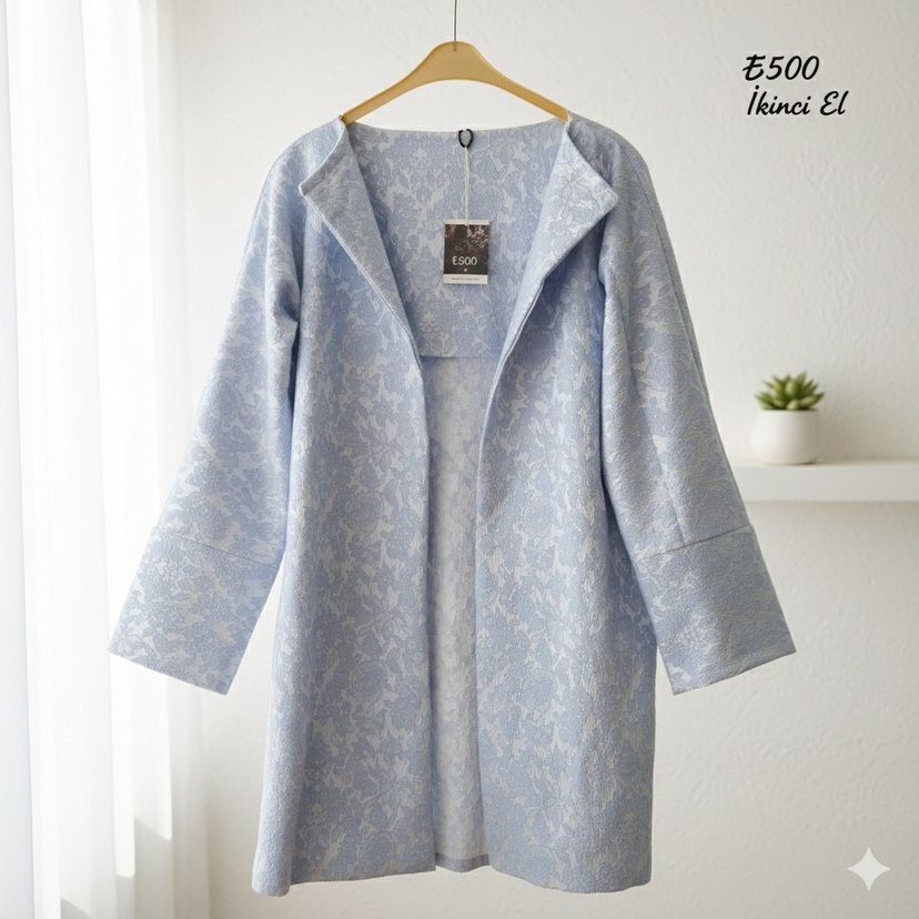 Mavi ve beyaz tonlarda brokar kumaştan uzun, bol kesim kadın kaftan. Çentikli yaka ve drapeli tasarımıyla modern klasik tarzda, günlük kullanım için uygun.