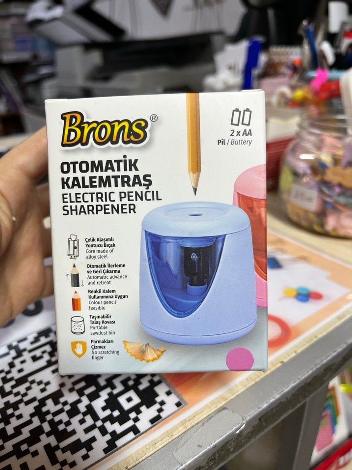 Brons elektrikli kalemtıraş, çelik bıçak, otomatik açılma ve şeffaf kalemtıraş haznesi içerir.