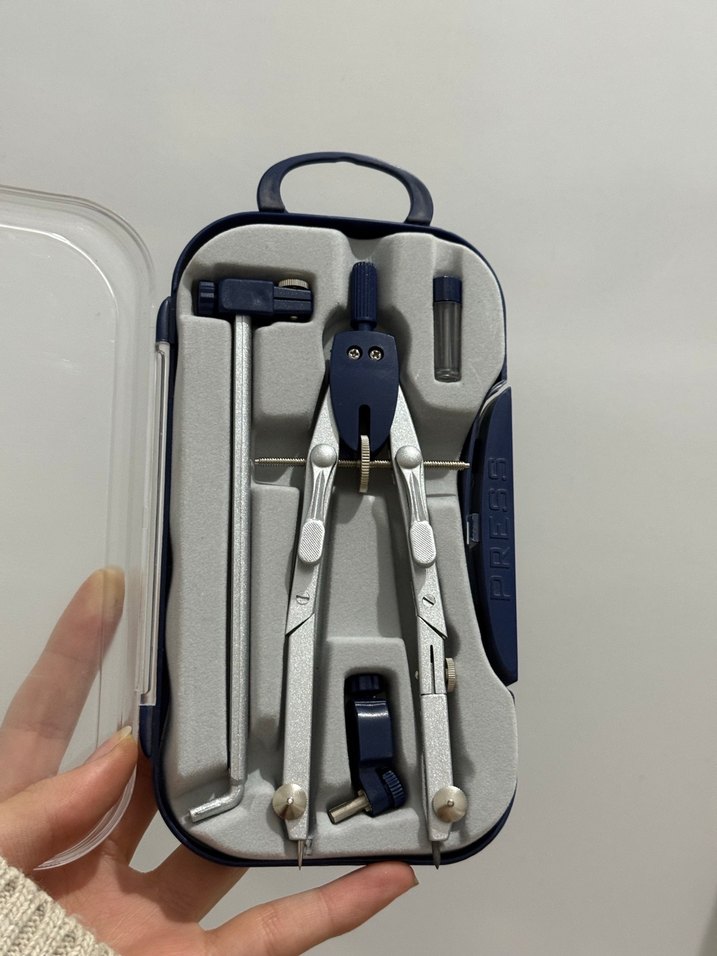 Mavi ve gri renklerde, bölücü, kalem tutucu ve ek parçalar içeren kompakt pergel seti. içinde yedek uçları da vardır, sadece 1-2 kere kullanıldı herşey tam ve sağlam.