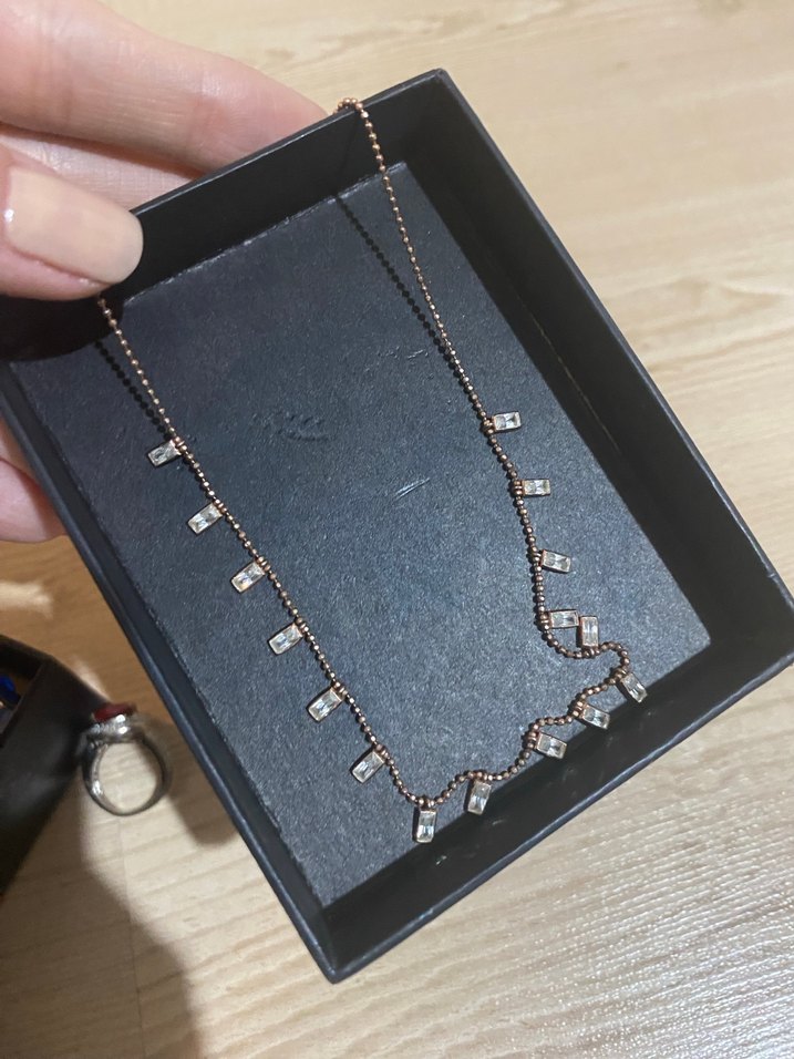 Baget taşlı su yolu bronz renk 925 Ayar gümüş kolye çok zarif duruyor parlatılmaya ihtiyacı var 1kez kullanıldı taşları sorunsuzdur