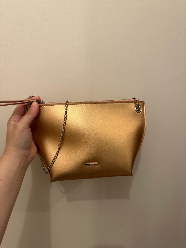 Bronz renk kadın çanta, fermuarlı kapanış ve zincir askıya sahip. Parlak yüzeyli, minimal ve desensiz tasarımla günlük ve gece kullanıma uygun.
