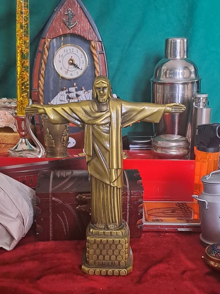 Parlak bronz renkte, kolları açık İsa heykeli. Detaylı bir kaide üzerinde duruyor ve dekoratif bir hava katıyor. ⛪