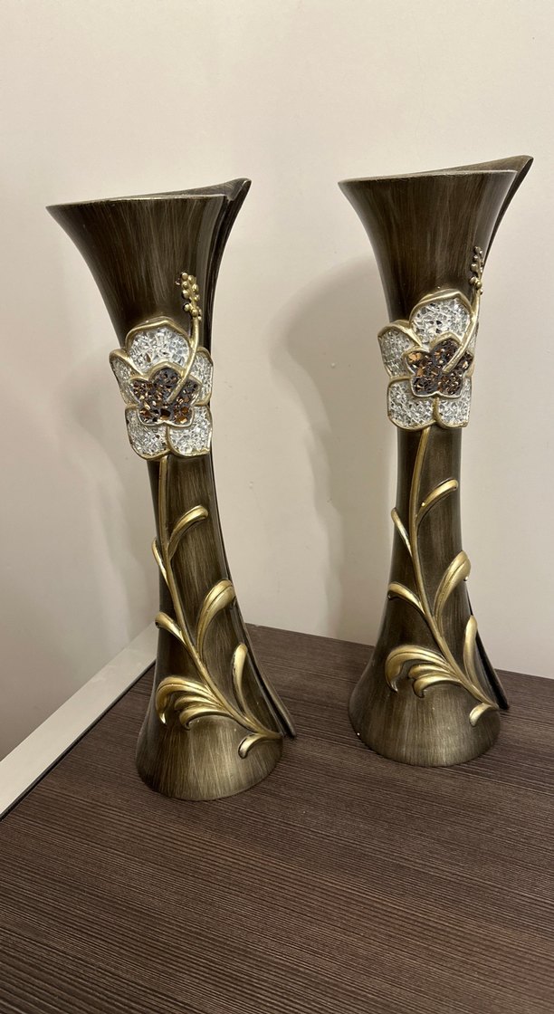 Koyu altın renkli, çiçek ve yaprak süslemeleriyle dekoratif vazo çifti. Yüksek ve şık tasarıma sahip. 39 cm boyundadırlar.