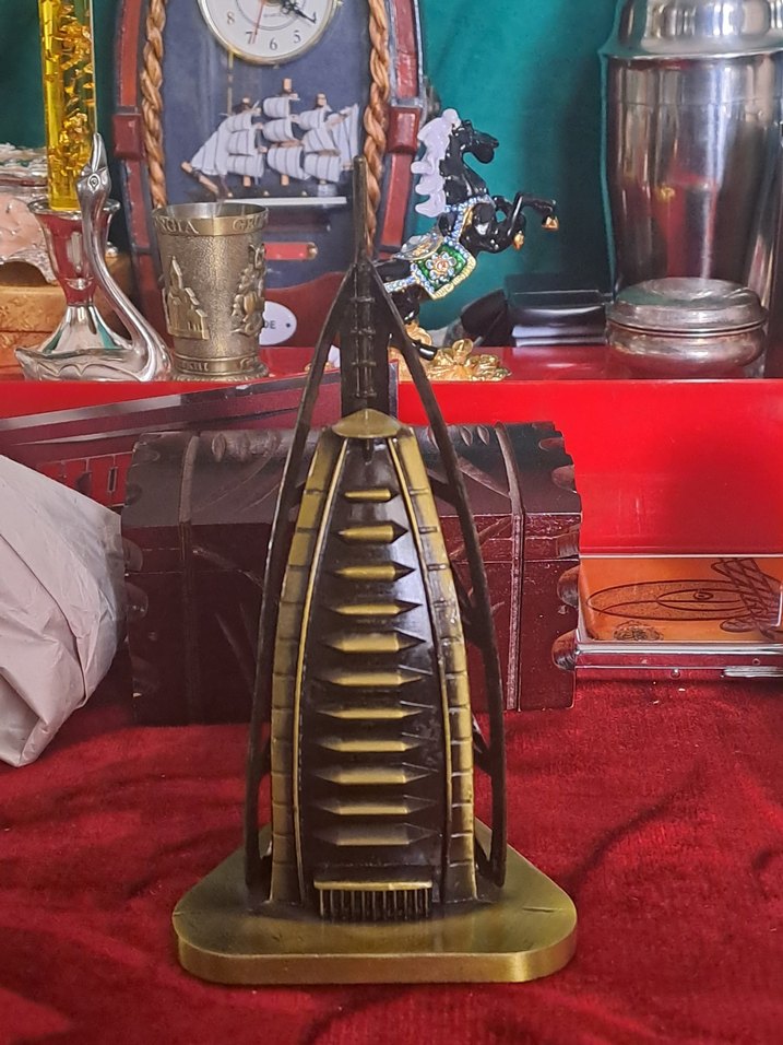 Katmanlı yapıya sahip, altın renkli ve koyu tonlu modern mimari tarzda figürin.
