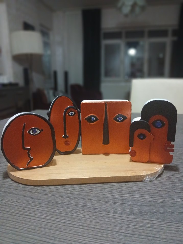 Geometrik şekillerde, bronz tonlarda soyut yüz figürleri seti, dekorasyon için uygun. El emeği 4 yüz seti.