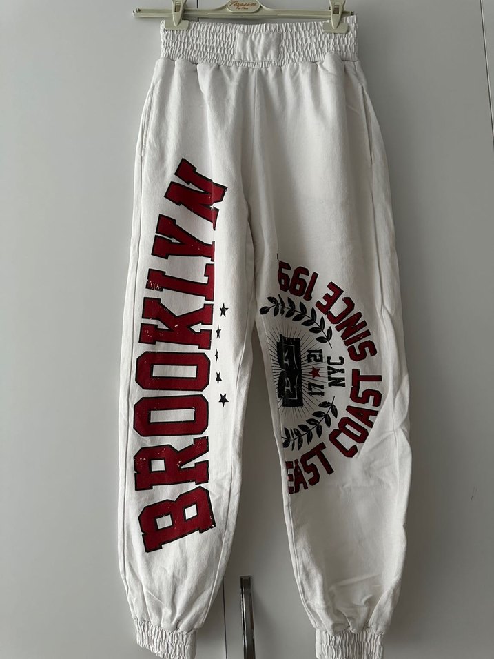 Beyaz pamuklu, bol kesim ve kemerli Brooklyn baskılı kadın eşofman, sportif sokak stili için uygun. Sadece bir kere giyilmiştir.