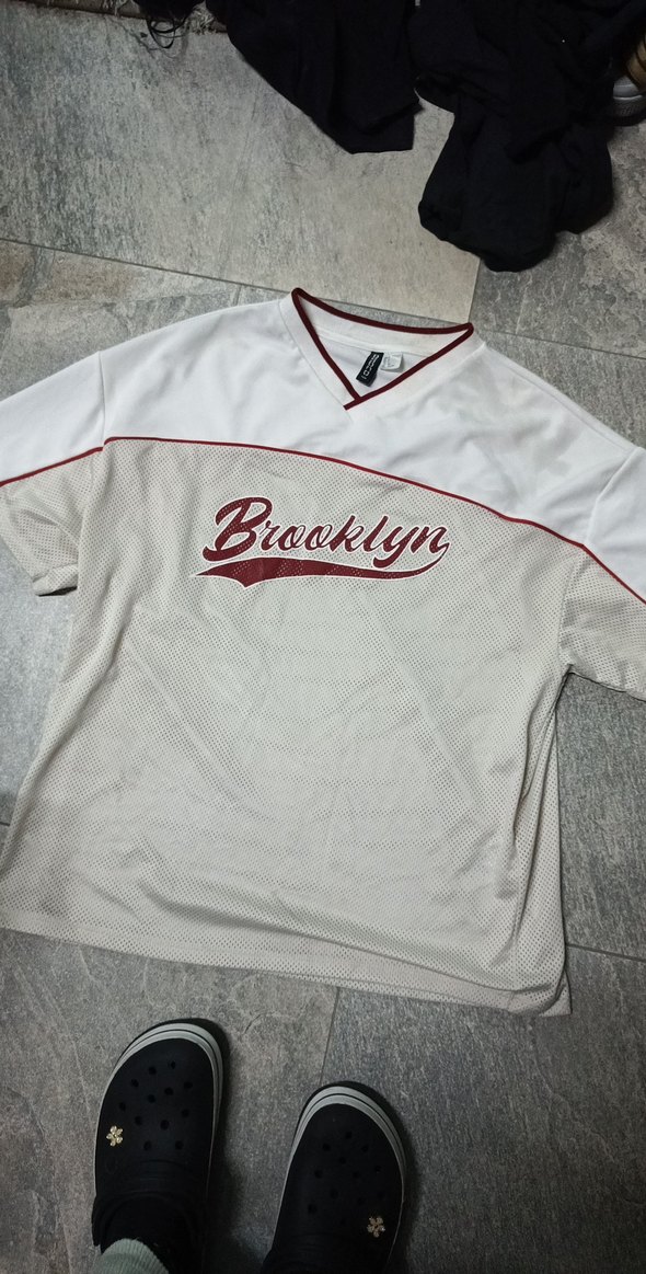 Pamuklu kumaştan, gri beyaz renklerde, kısa kollu ve V yakalı, bol kesim erkek tişört. Üzerinde "Brooklyn" baskısı ve düğme detayları bulunur.