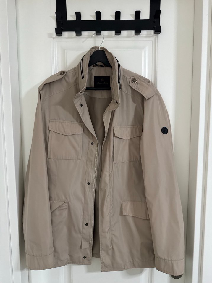 Bej renkli, düğmeli erkek ceket. Notlu yaka ve uzun kollu, sentetik kumaştan üretilmiş, günlük kullanıma uygun, rahat kesim.