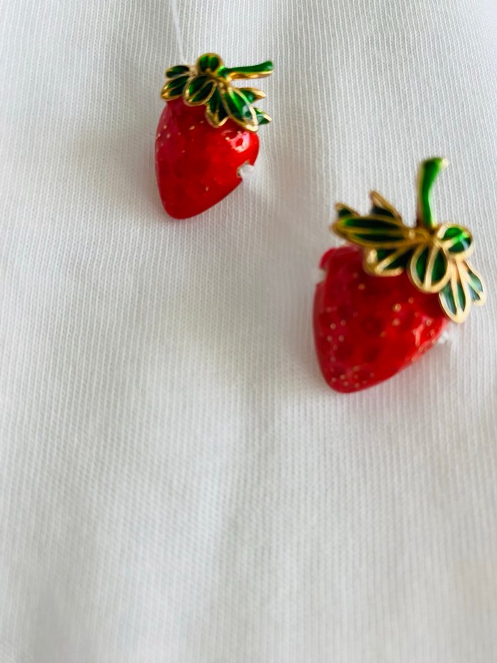 Parlak kırmızı çilek figürlü, çilek taşlı broş lu tişört kalıbı daha çok l gibi