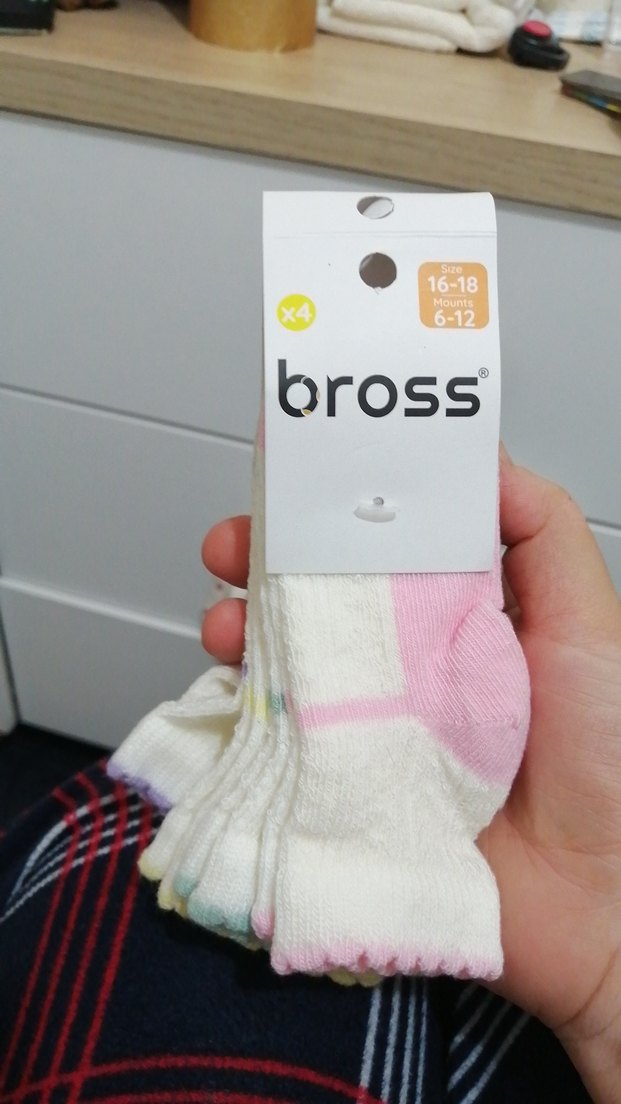 Bross markalı, 16-18 numara kız çocuk çorapları pamuklu ve renkli baskılıdır. 6-12 ay arası çocuklar için uygundur.