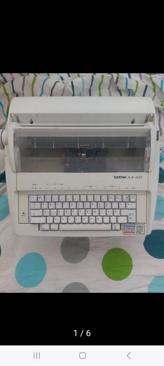 Brother AX-410 beyaz pastel renkte, şeffaf kapaklı ve tam QWERTY klavyeli daktilo. Üzerinde tanımlama etiketi bulunur.