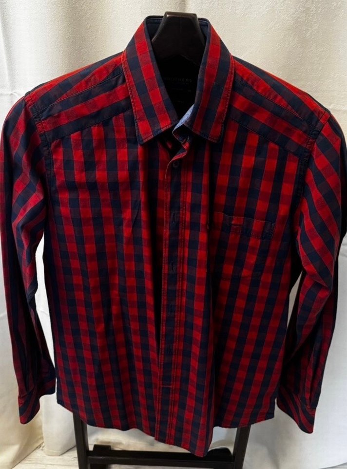 Brothers markasının özel "Kansas Indigo" serisinden, çok şık koyu kırmızı-lacivert ekoseli erkek gömlek. %100 pamuklu kumaşı ile hem kaliteli hem de konforludur. • Beden: M (Modern Fit / 40) • Durum: Çok temiz kullanıldı, herhangi bir defosu, renginde solma veya yıpranma yoktur.