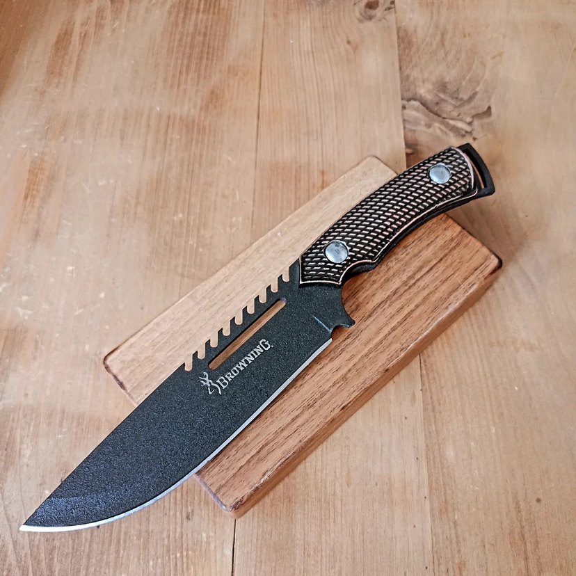 Browning bıçağı, dokulu kavrama sağlayan koyu kahverengi sap ve tırtıklı keskin uca sahip.