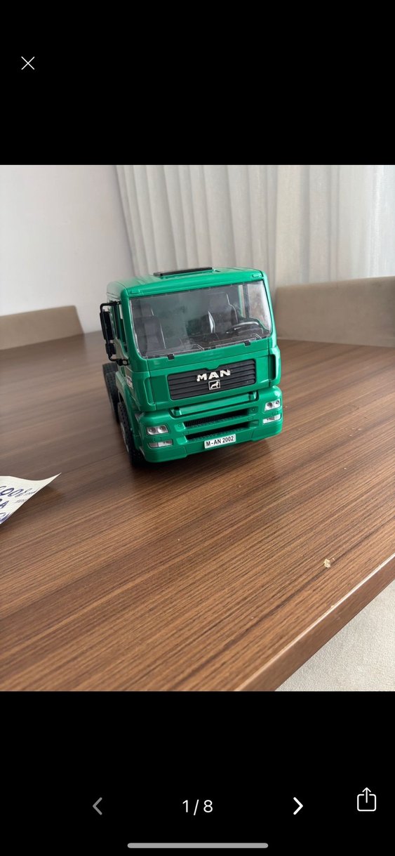 Koyu yeşil renkte, önünde MAN logosu bulunan detaylı tasarımlı oyuncak kamyon. Şeffaf ön camı vardır.