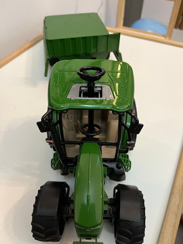 Koyu yeşil renkli oyuncak traktör, ayrıntılı direksiyon ve büyük siyah tekerleklere sahiptir.