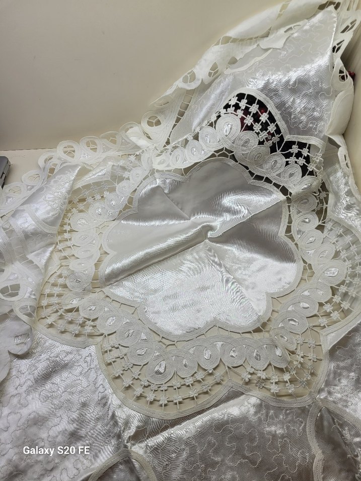 Parlak kumaştan, işlemeli desenlere sahip beyaz masa örtüsü, 85cm.e 85cm.lekesiz hiç kullanılmamış çeyizlik. ✨