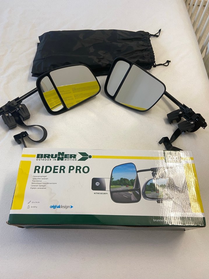 Ayarlanabilir kelepçeli ve çift yansıtıcı yüzeyli Brunner Rider Pro aynaları. Taşıma çantası ve orijinal kutu ile birlikte. Sıfır hiç kullanılmadı.