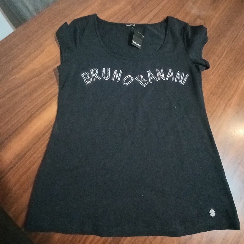 Pamuk kumaştan yapılmış, kısa kollu ve bisiklet yakalı siyah tişört Önünde parlak taşlarla işlenmiş "BRUNOBANANI yazısı bulunur. Günlük kullanım için uygundur.