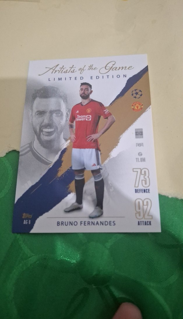 Siyah ve deve tüyü tonlarında, Bruno Fernandes'in saldırı ve savunma puanlarıyla sınırlı üretim rozeti. Sokak modasına uygun tarzda. ⚽