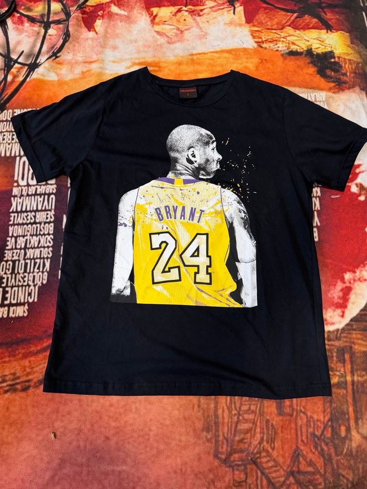 Siyah, kısa kollu, yuvarlak yaka, baskılı ve loose fit erkek tişörtü. Sarı 24 numaralı Bryant forması baskısı bulunur. Sentetik kumaştan üretilmiştir.