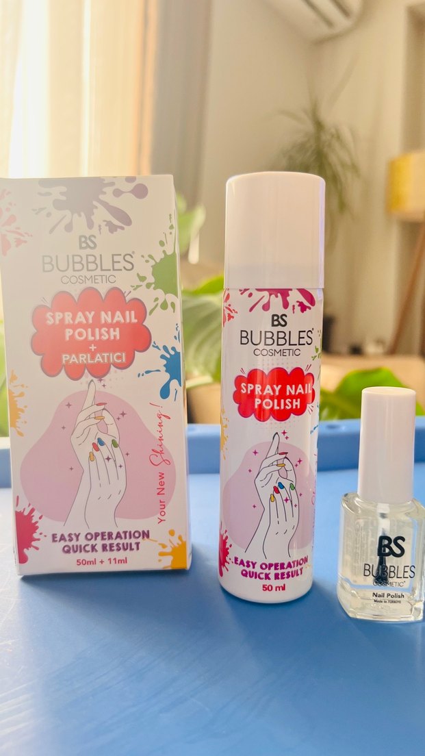 BS Bubbles Cosmetic sprey oje temizleyici 50ml ve 11ml oje içerir. Kolay kullanım ve hızlı sonuç sağlar.