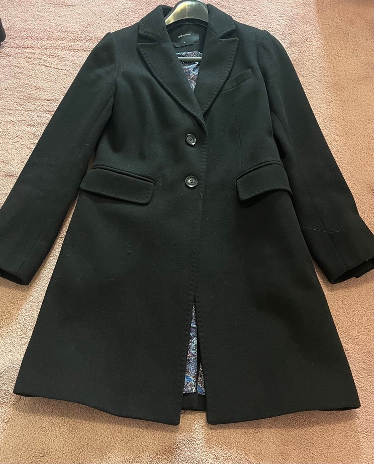 İki düğmeli ön kapama ve kapaklı ceplere sahip siyah kaban, desenli iç astarıyla dikkat çekiyor. Bir kere giydim klasik modası hiç geçmeyen model kalıp süper çok ısıtıyor orjinaldir yunanistan ürünüdür etiketinde 40 beden yazar fakat bizim bedenimize göre 36-38 uyumludur