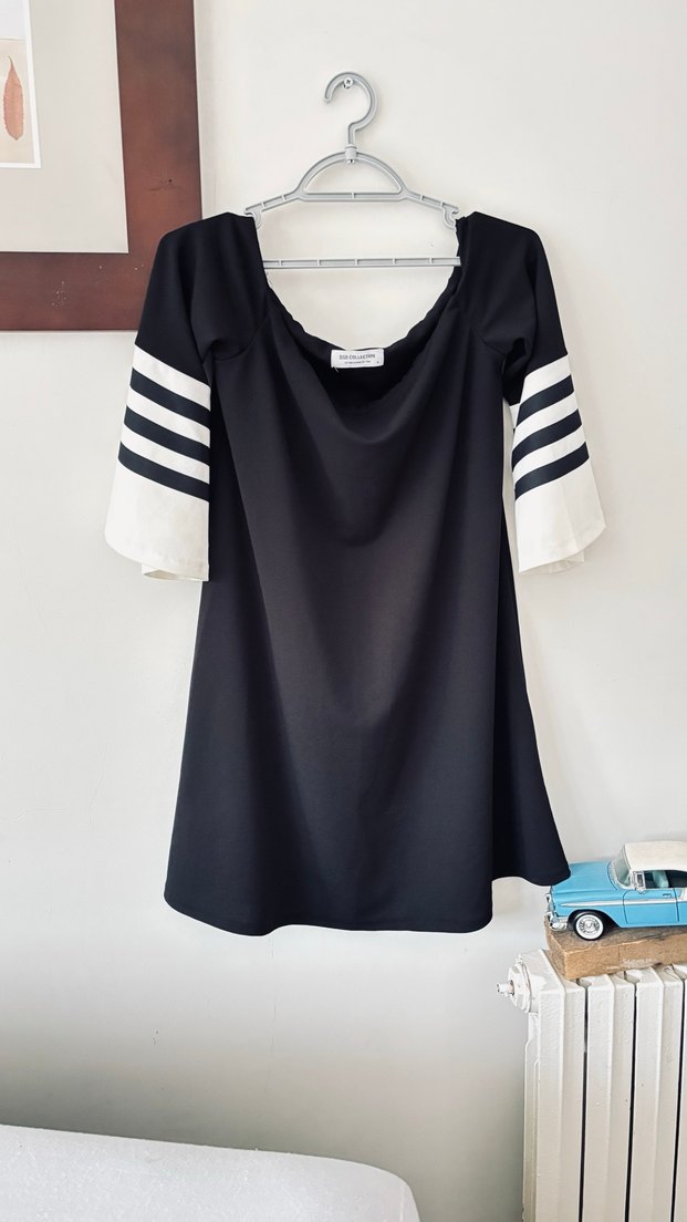 Siyah midi elbise, kayık yaka ve kısa kolludur. Kollarda beyaz üzerine siyah baskılı çizgiler bulunur. Salaş kesim ve drapeli tasarıma sahiptir.m beden