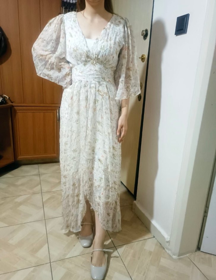 V yakalı, uzun kollu, dökümlü beyaz bohem elbise. Gevşek kesim, pastel tonlarda tie-dye deseni ve yumuşak sentetik kumaş içerir.